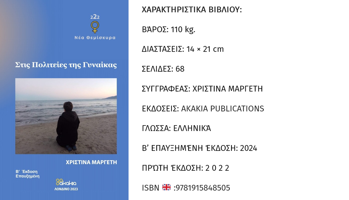Το 2023 κυκλοφόρησε η δεύτερη διευρυμένη έκδοση του βιβλίου μου, εμπλουτισμένη σε περιεχόμενο, διατηρώντας πάντα την αρχική του αυθεντικότητα, σε περισσότερα αντίτυπα και με πιο σύντομο τίτλο αυτή τη φορά : ” Στις πολιτείες της Γυναίκας”.